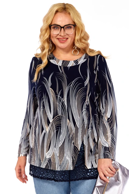 Модель имеет свободный крой оверсайз, который обеспечивает идеальную посадку на фигуру Plus Size (от 54 до 64), скрывая нежелательные объемы и гарантируя полную свободу движений. Блуза оснащена длинным втачным рукавом и классическим круглым вырезом горловины. Для дополнительного совершенства силуэта предусмотрены мягкие подплечники из тонкого поролона, которые аккуратно приподнимают линию плеч.