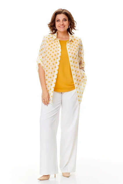 В комплект входит трикотажная майка-топ с широкими нерегулируемыми бретелями без рукавов желтого цвета с нагрудными вытачками, которая выполняет роль легкой дышащей подкладки, но майку, как и блузу можно одевать отдельно.