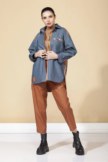 Рубашка комбинированная из двух видов ткани однотонного джинса и клетки, со стояче-отложным воротником на отрезной стойке и притачными фасонными планками с застежкой на 7 пуговиц, перед с накладным карманом и печатью по низу, спинка с кокеткой и 2 складками, рукава спущены, с притачными манжетами и планками по низу, с разрезами по боковым швам и фигурным низом.