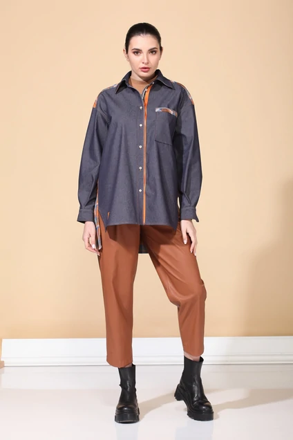 Рубашка комбинированная из двух видов ткани однотонного джинса и клетки, со стояче-отложным воротником на отрезной стойке и притачными фасонными планками с застежкой на 7 пуговиц, перед с накладным карманом и печатью по низу, спинка с кокеткой и 2 складками, рукава спущены, с притачными манжетами и планками по низу, с разрезами по боковым швам и фигурным низом. Длина 82 см, рукав 62 см.