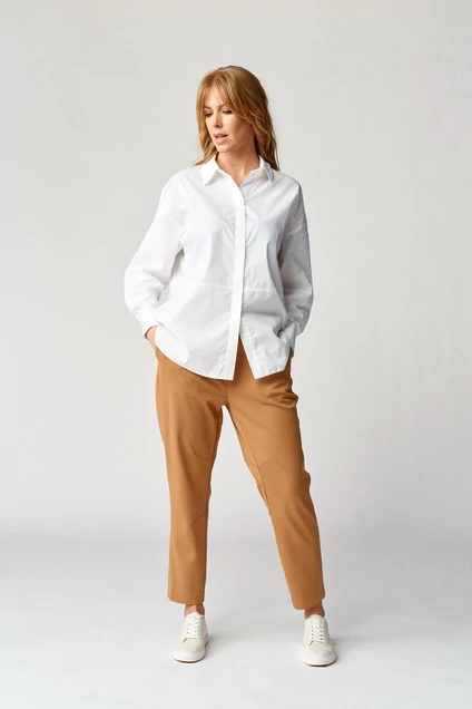 Интересная рубашка, оверсайз, из хлопка прекрасно сочетается с брюками и юбками. Рубашка - обязательная вещь для базового гардероба стильной современной женщины. Она позволяет легко составлять нарядные, деловые и повседневные образы, меняя только аксессуары. Стильная рубашка свободного кроя с центральной планкой на потайную застёжку по полочке. Плечо спущено. Рукав с широкой манжетой. Воротник со стойкой. Низ изделия фигурный. Рубашка по спинке длиннее переда. Длина рубашки по спинке 75 см. Длина рукава от плеча 49 см. Длина рукава от горловины 73,5 см.