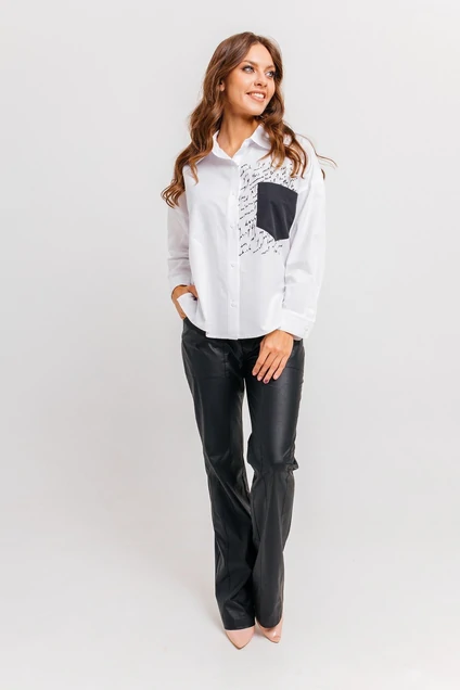 Эффектная рубашка прямого кроя с втачным рукавом. Горловина обработана рубашечным воротником с отрезной стойкой. На части переда накладной карман, принт ручной работы "письмо", застёжка центральная на петли-пуговицы. Низ рукава обработан притачным манжетом, застёгивается на петли-пуговицы. Длина изделия 77 см.