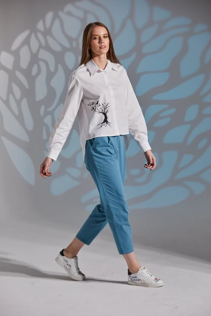 Рубашка женская оригинального кроя со спинкой назапах и втачным рукавом. Горловина обработана рубашечным воротником с отрезной стойкой. Застёжка центральная на петли-пуговицы. Низ рукава обработан притачным манжетом, застёгивается на петлю-пуговицу. Изделие с принтом ручной работы "птицы и дерево" по полочке.