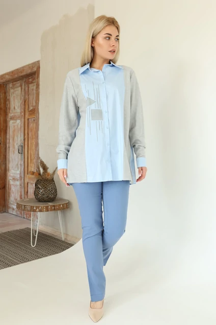 Хлопковая рубашка, комбинированная с фактурным трикотажем "косичкой" по переду и на рукавах. Изделие прямого кроя с втачным рукавом. Горловина обработана рубашечным воротником с отрезной стойкой. На правой части переда принт ручной работы "геометрия", застёжка центральная на петли-пуговицы. Низ рукава обработан притачной манжетой, застёгивается на петли-пуговицы. На спинке изделия отлетная кокетка и бантовая складка. Длина изделия 77 см.