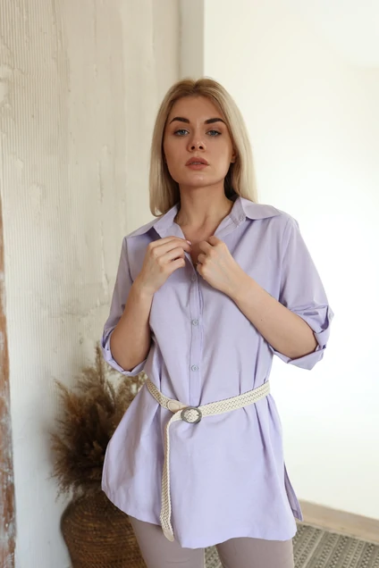 Рубашка хлопковая удлиненная свободного кроя с центральной застёжкой средней длины на петли-пуговицы со стояче-отложным воротником. Рукава с манжетой, застезиваются на петлю-пуговицу. Ремень входит в комплект, может отличаться от заявленного на фото.