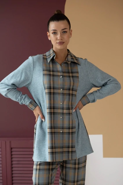 Уникальная рубашка, комбинированная с фактурным трикотажем "косичкой" по переду и на рукавах. Изделие прямого кроя с втачным рукавом. Горловина обработана рубашечным воротником с отрезной стойкой. Застёжка центральная на петли-пуговицы. Низ рукава обработан притачной манжетой, застёгивается на петли-пуговицы. На спинке изделия отлетная кокетка и бантовая складка. Длина изделия 77 см.