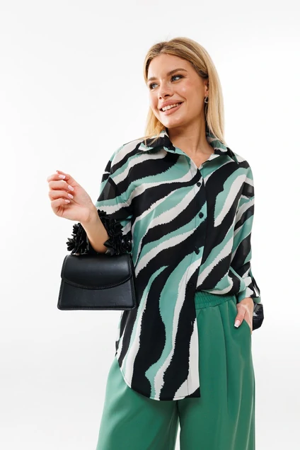 Рубашка свободногго силуэта,с центроально бортовой застежкой по переду на петли пуговицы.Воротник отложной стойка.Спинка с кокеткой, Рукав длинный на пате