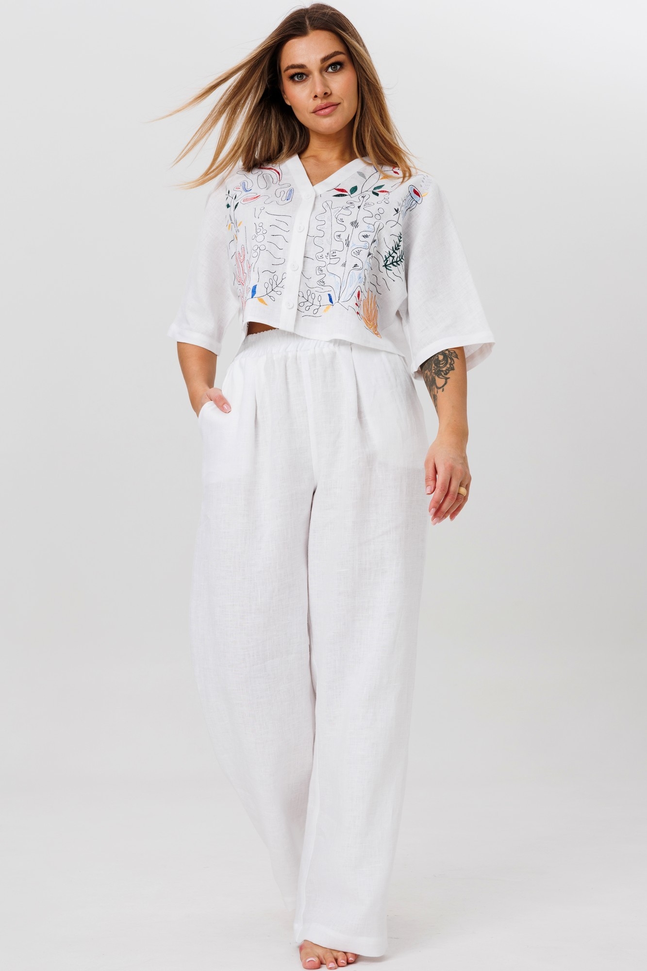 Женская укороченная льняная рубашка AMIE свободного силуэта.
