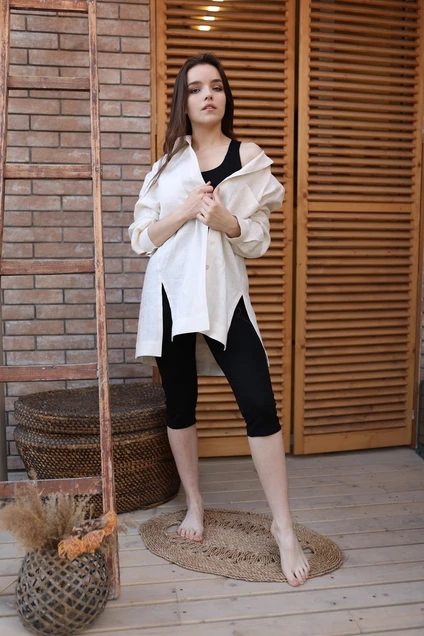 Льняная удлиненная рубашка с разновеликим низом. Застежка спереди на пуговки из натуральных материалов. Изделие имеет специальный крой и сложно-обработанные все швы.