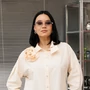 Блузка женская, прямого силуэта со спущенным плечом. Благодаря покрою оверсайз - станет базовой вещью в вашем гардеробе. Легко сочитается с любыми брюками, юбками , платьями и джинсами. Позволит создать большое количество образов для офиса, прогулок, праздничных мероприятий. По спинке идет кокетка со складками, по боковому шву-складка. Рукав на завязывающейся манжете со сборкой. В верхней части рукова- встречная складка. Воротник на отрезной стойке. Застежка на петли и пуговицы. Низ фигурный, спинка длинее. В качестве декора по стойке пуговица со стразами в виде сердца. Длина спинки: (48-52)-81см., (54-58)-85см. Длина рувака с манжетой: (48-52)-43см., (54-58)-44см.