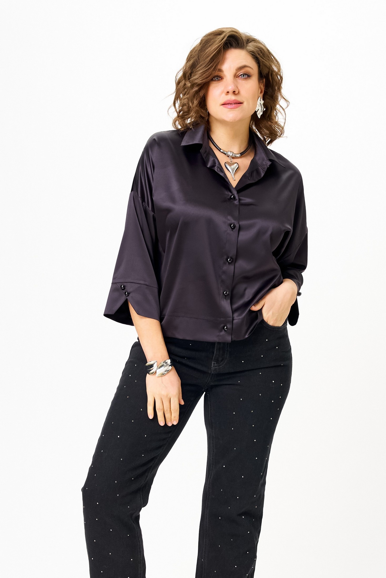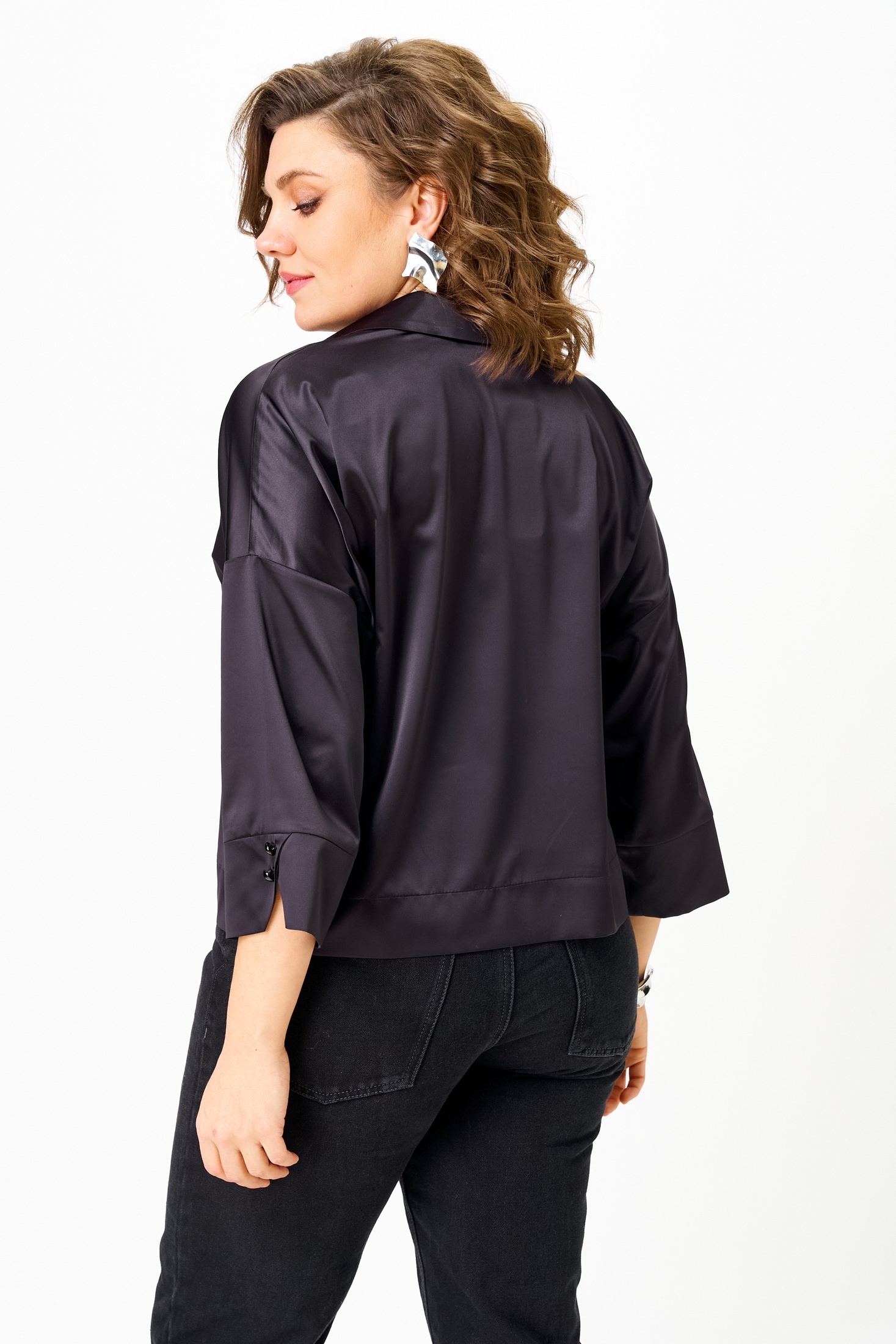 Блузка женская из атласной тукни, прямого силуэта со спущенным плечом. Благодаря своему крою станет базовой вещью в вашем гардеробе. Легко сочетается с любыми брюками, юбками, платьями и джинсами. Позволит создать большое количество образов для офиса, прогулок, праздничных мероприятий. Застежка- планка на петли и пуговицы. Воротник на отрезной стойке. Рукав одношовный, втачной, 3/4 длины с манжетой. В качестве декора- по манжете пуговицы, по низу блузки широкая подгибка с отстрочкой. Длина блузки (50-54)- 53см, (56-60)-55см . Длина рукава (50-60)-32см.