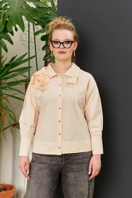Блузка женская с акцентным декором полуприлегающего силуэта. Рукав "летучая мышь" с подрезом по линии проймы и односторонними складками и манжетой. Застежка- планка на петли и пуговицы. Воротник стояче-отложной. В качестве декора - дополнительный воротник, плавно переходящий в цветок. Благодаря своему крою станет базовой вещью в вашем гардеробе. Легко сочетается с любыми брюками, юбками, платьями и джинсами. Позволит создать большое количество образов для офиса, прогулок, праздничных мероприятий. Длина блузки (50-54)- 58см, (56-60)-61 см . Длина рукава от горловины с манжетой (50-54)-68см, (56-60)-70см.