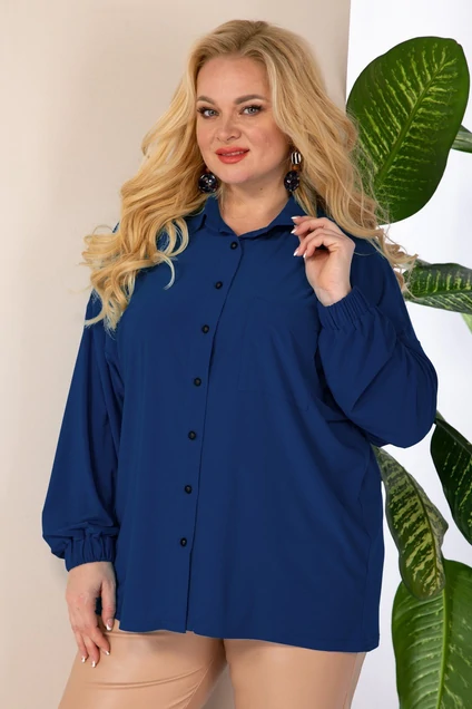 Блузка женская, прямого силуэта, из трикотажного полотна "масло",со спущенным плечом. Застежка модели на планку и пуговицы, воротник на стойке, по полочке идет накладной карман, манжет рукава на резинке. Длина (по спинке): (46-50)-72см., (52-56)-74см., (58-62)-75см. Длина рукава (с манжетой): (46-62)-50см.