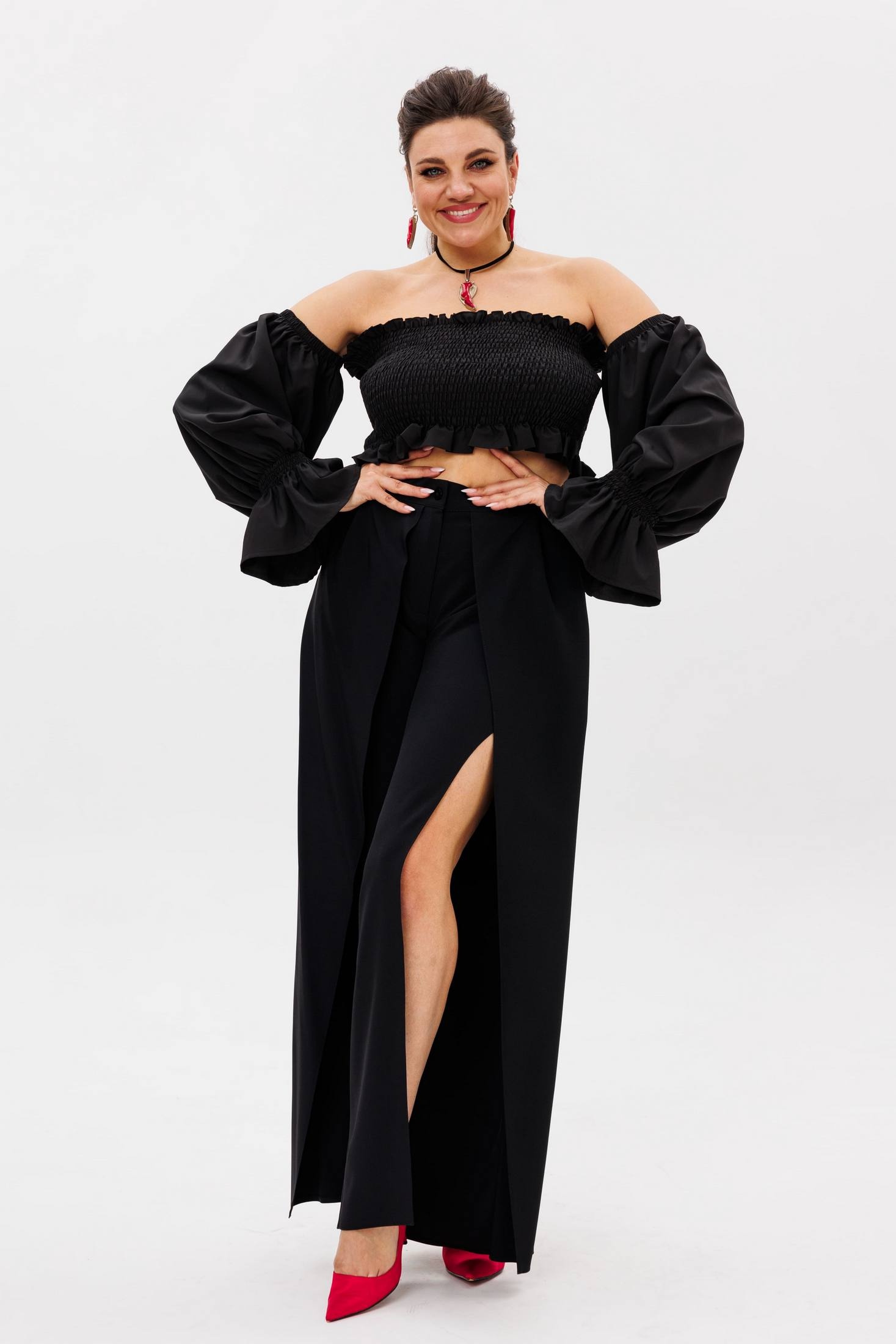 Блуза станет как ярким элементом нарядного образа для выхода в свет, так и стильной основой для повседневных луков. На модели образ с брюками 1442 .