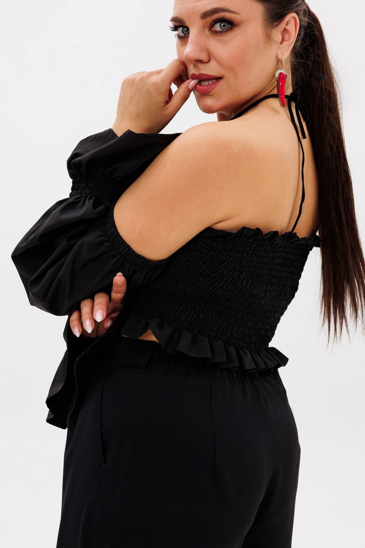 Эффектные сборчатые рукава можно носить классически на плечах или спустить их, создав соблазнительный образ с загадочным акцентом на зоне декольте.