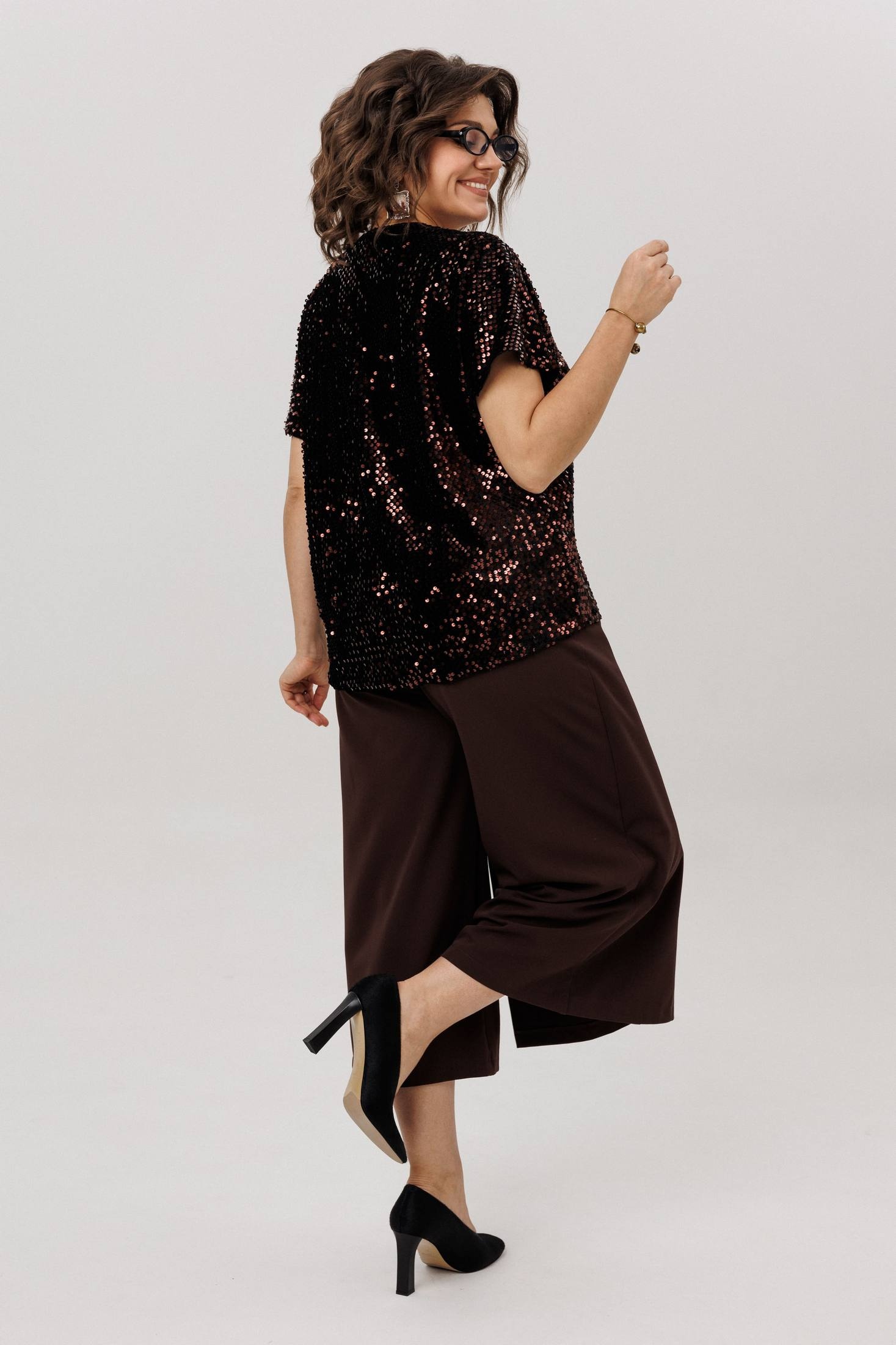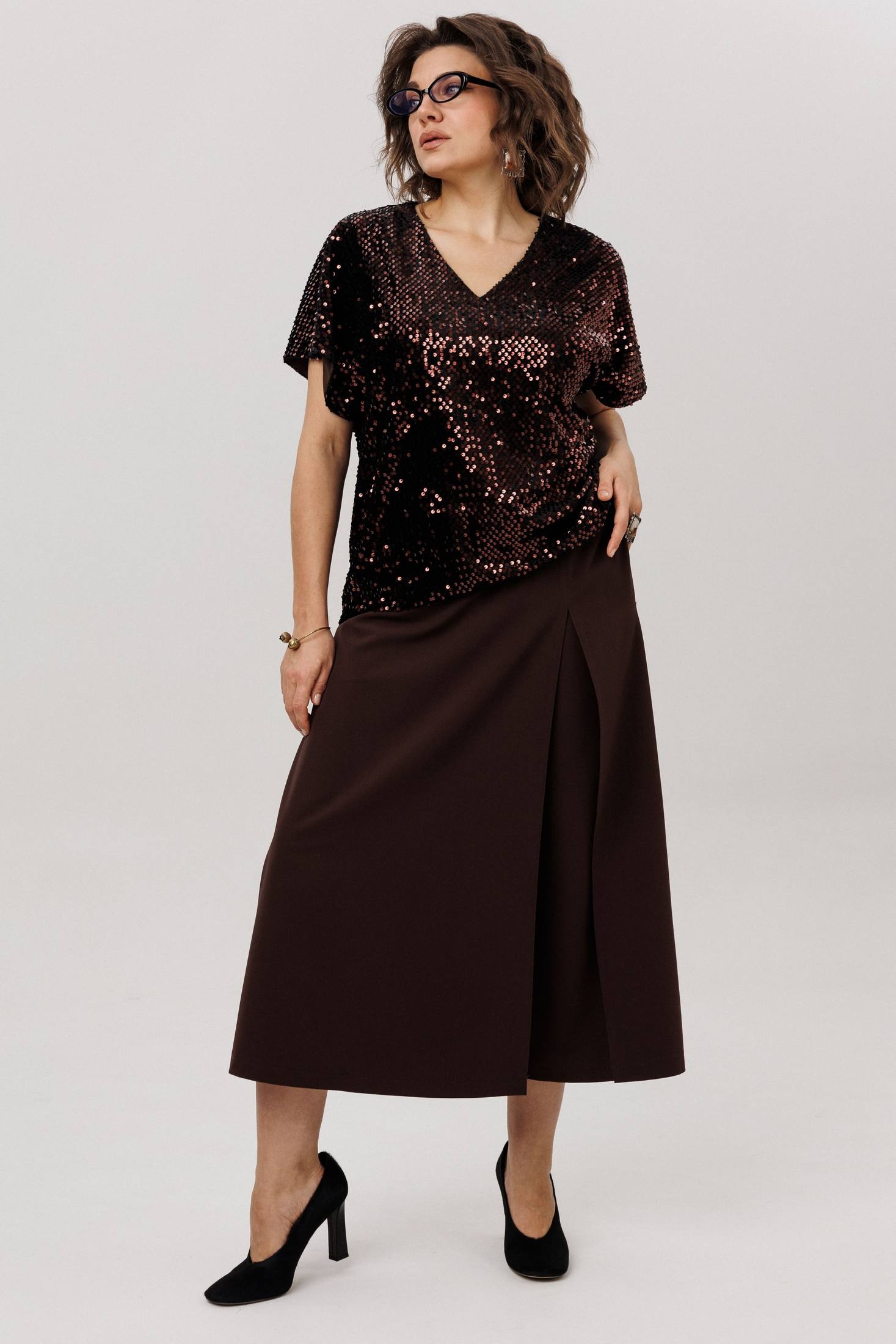 На модели в блузоне цвета «арманьяк» атласная юбка 1410, юбка-брюки 1783.