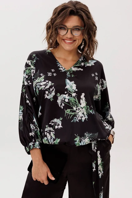 Особую динамику и индивидуальность блузе придают детали: цельнокроеные рукава три четверти подчёркивают целостность и плавность линий, а притачной пояс и манжеты, собранные в нежную сборку благодаря эластичной резинке, создают выразительный контраст с текучестью основной ткани. Эта умная конструкция позволяет вам самостоятельно регулировать длину блузы, творчески преобразуя её силуэт — от парящего и расслабленного до более собранного и чёткого.