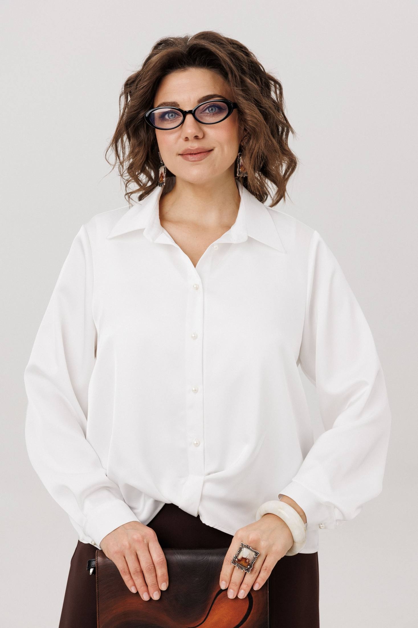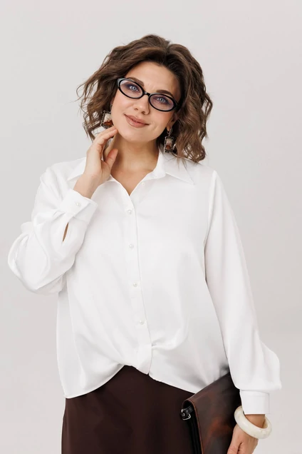 Тон задают безупречные детали: строгий отложной воротник на стойке, чёткая линия застёжки на пуговицах и идеальные втачные рукава, собранные у запястья в изящные манжеты. Их совершенство оттеняет смелая игра кроя - асимметричный низ, и та самая изысканная деталь в виде мягкого узла, которая придаёт силуэту запоминающийся художественный штрих