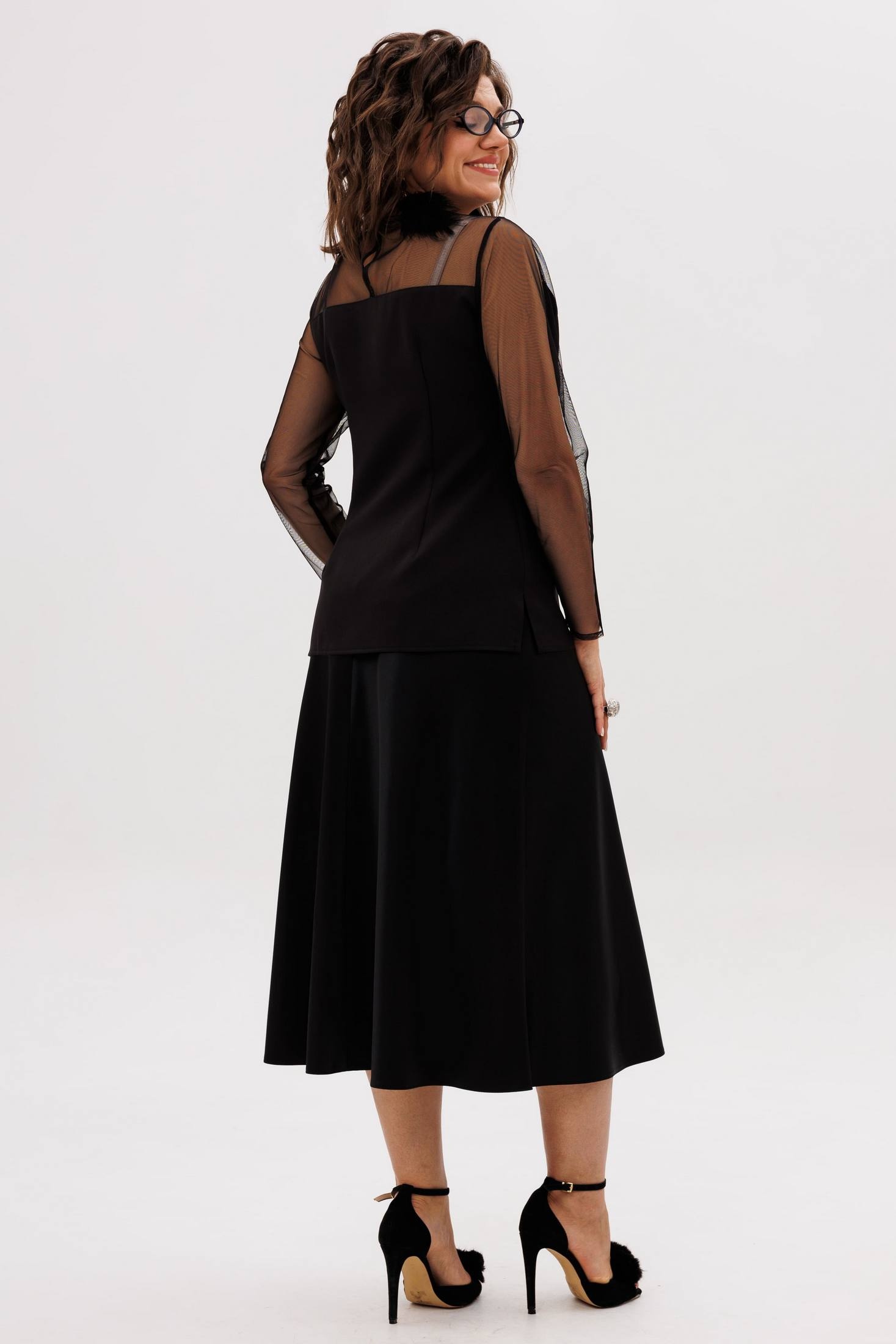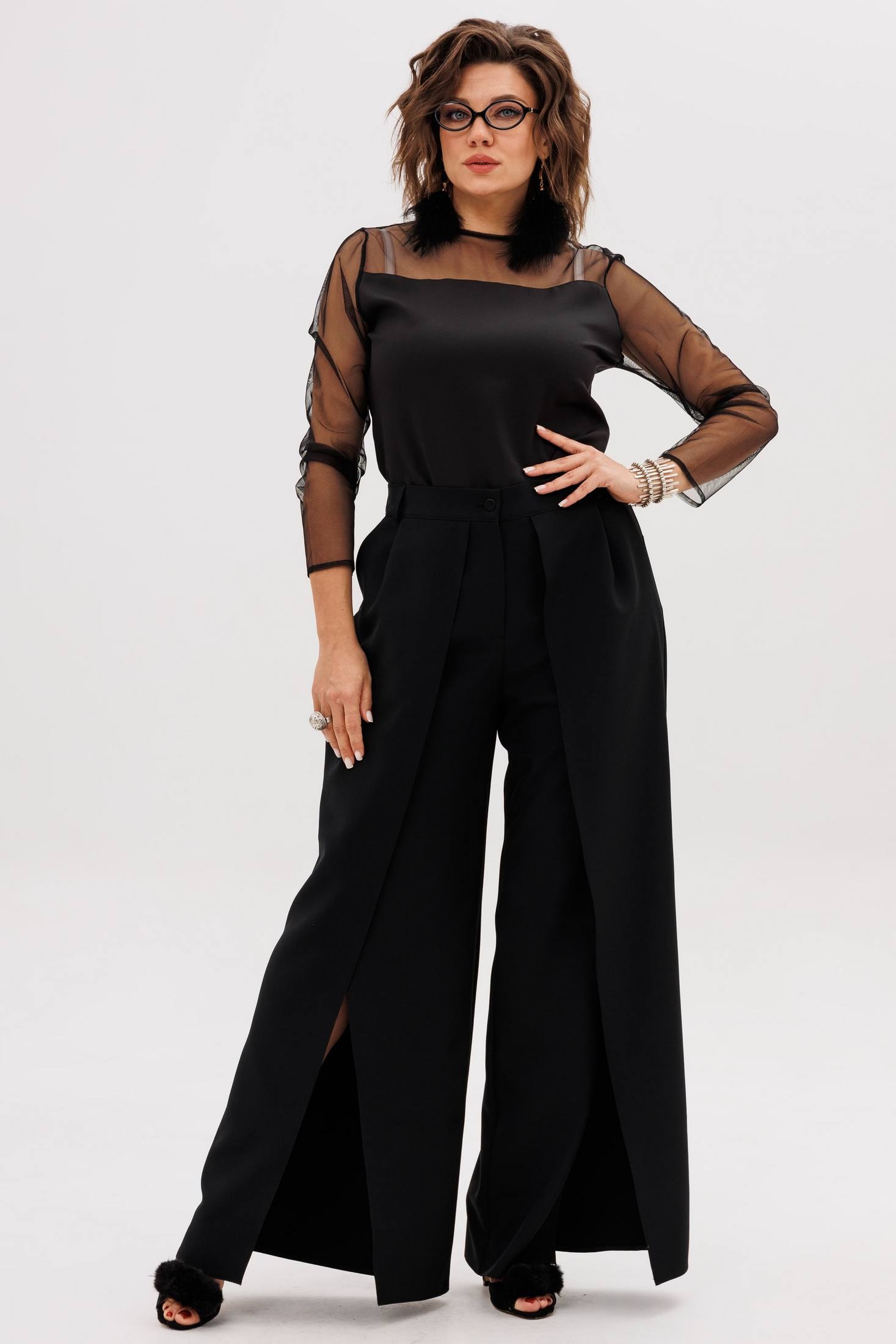 На модели собраны образы с юбкой 1291 и брюками 1442 от Анелли. Рукава и кокетки: полиэстер 100%.