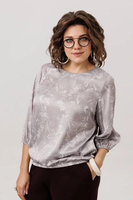 Её мягкий, обнимающий шею круглый вырез подчёркивает изящество, а рукава три четверти с аккуратными манжетами добавляют образу лёгкую, воздушную ноту. Особую прелесть и практичность блузе придаёт мягкая резинка по низу, позволяющая легко регулировать длину и степень прилегания, создавая идеальный баланс между удобством и элегантностью. Всё это великолепие завершает нежный цвет «перезвон ветра», превращающий простоту кроя в настоящее ежедневное вдохновение.