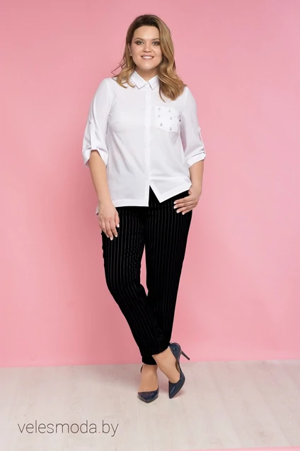 Категория: Блузка женская сезон: Весна, Лето цвета: Белый ткань: Хлопок 97% Эластан 3%. Не тянется. Замеры для (48) размера. Длина по спинке:80 см. Длина рукава: 41 см. Рукав:3\4 Силуэт: Свободный Статус: Офисно-повсидневное. Декор: Карман по переду блузы украшен жемчугом. Так же жемчужные пуговицы на рукаве и воротнике.