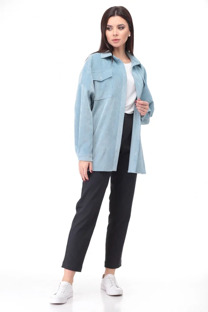 Рубашка женская, свободного кроя. Перед с нагрудными карманами и центральной застежкой на кнопки. Рубашка со спущенным плечом. Рукав длинный, втачной. Низ рукава с манжетой. Воротник втачной со стойкой. К рубашке прилагается съемная сумочка в цвет рубашки