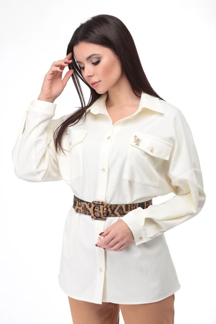 Рубашка женская, свободного кроя. Перед с нагрудными карманами и центральной застежкой на петли пуговицы. Рубашка со спущенным плечом. Рукав длинный, втачной. Низ рукава с манжетой. Воротник втачной со стойкой. Пояс прилагается.