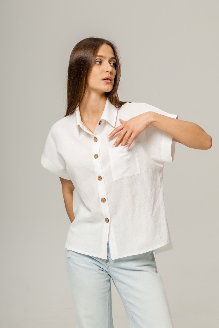 Эта стильная рубашка из умягченного льна белого цвета идеально подойдет для создания летнего образа. Материал прошел специальную энзимную обработку, благодаря которой изделие приятное к телу и не дает усадки. Рубашка имеет свободный прямой крой с элегантными спущенными плечами. Оснащена центральной застежкой на петли и пуговицы, что добавляет удобства при носке. Классический рубашечный воротник и один накладной карман на груди усиливают универсальность модели. Дизайн дополняется кокеткой на спинке и нежной складкой для большей свободы движений. Фронтальная часть рубашки выполнена короче, что придает изделию современный вид. Эта рубашка станет отличным выбором как для повседневного, так и для более официального гардероба.