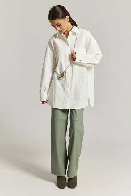 Рубашка выполнена из белой хлопковой ткани. Прямого свободного силуэта. По переду застежка на пуговицы, воротник классический, рукав спущенный на манжете с пуговицей. По переду боковой карман по верху изделия. Модель в едином размере.