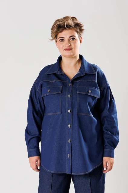 Рубашка женская свободного кроя. С длинными спущенными рукавами с манжетами и защипами по окату рукава. Воротник отложной на стойке. Застежка на пуговице. Длина по спинке 72 см
