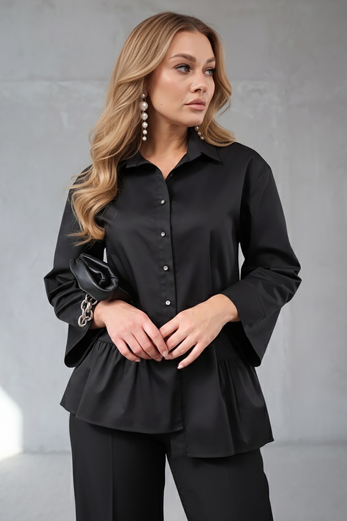 Низ: оформлен пеплумом (легкая оборка по линии низа), что добавляет объёма и женственности.