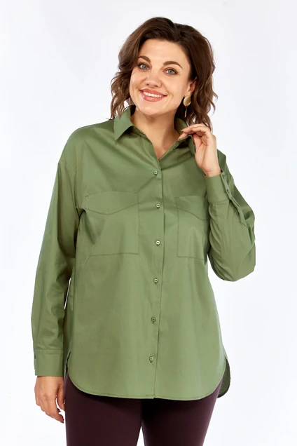 Рубашка свободного силуэта. Рукав рубашечный с разрезом и складками,заканчивается манжетой, которая застегивается на 2 петли и пуговицы.Плечо спущенное. На спинке двойная кокетка, от кокетки по центру спинки идет встречная складка. На переде вверху 2 симметричных накладных кармана. Длина по спинке(от точки основания шеи) -80см, длина по переду(от точки основания шеи)-75,5см, длина рукава+манжета-54,5см, длина плеча-21см. Ткань поплин, тянется по ширине.