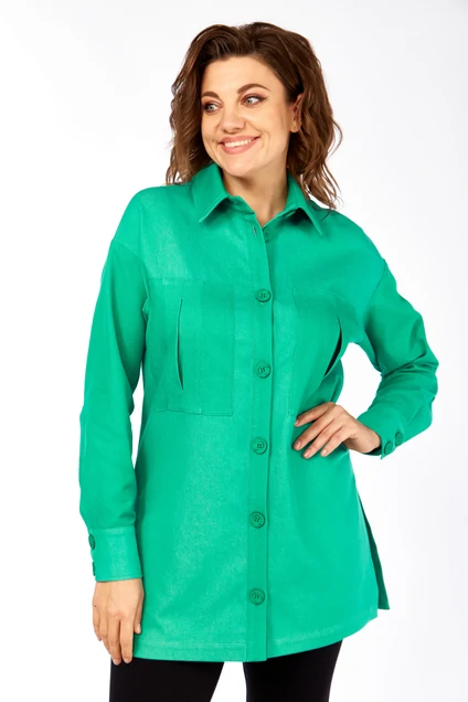 Рубашка свободного кроя, в стиле оверсайз. Силуэт свободный. На переде настрочены 2 фантазийных кармана. По боковым швам разрезы, отстроченные широкой отделочной строчкой. Рукав длинный двухшовный с длинным разрезом также отстроченным широкой отделкой. Плечо спущенное. Длина по спинке-80.5см, длина рукава+манжет-54см, длина плеча-20см, длина разреза-23.5см. Параметры модели: обхват груди-98см, обхват бедер-110см, размер топа на модели 50.