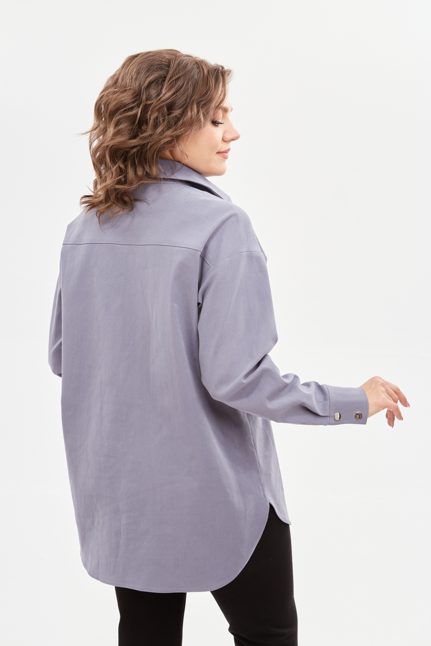 Рубашка свободного кроя.Низ переда и спинки закругленные, спинка чуть длиннее переда. Рубашка застегивается на металлические кнопки. На спинке кокетка. По всем швам выполнены отделочные строчки белой ниткой.Рукав рубашечный с разрезом и складками,заканчивается манжетой, которая застегивается на 2 кнопки. Длина по спинке(от точки основания шеи) -84.5см, длина рукава+манжета-58.5см, длина плеча-21.5см. Ткань плотный джинс. Параметры модели: обхват груди-98см, обхват бедер-110см, размер рубашки на модели 50.