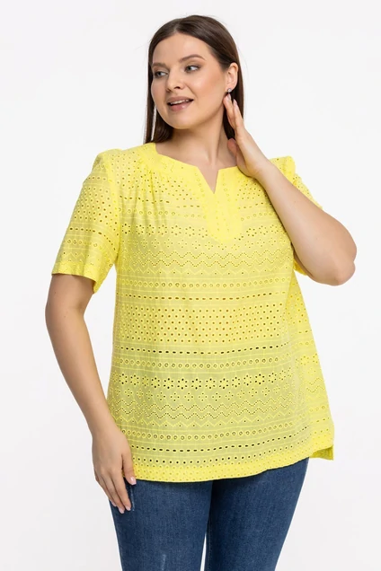 Нарядная летняя блузка декорирована изысканным кружевом. Фигурный вырез горловины выполнен с разрезом спереди. По бокам имеются разрезы. Прекрасный вариант на каждый день и для торжественного случая