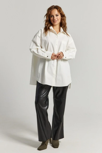 Рубашка выполнена из белой хлопковой ткани. Прямого свободного силуэта. По переду застежка на пуговицы, воротник классический, рукав спущенный на манжете с пуговицей. По переду боковой карман по верху изделия. Модель в едином размере (one size).