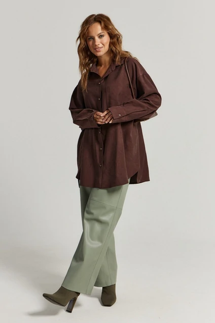 Рубашка в глубоком темно-коричневом цвете. Прямого свободного силуэта. По переду застежка на пуговицы, воротник классический, рукав спущенный на манжете с пуговицей. По переду боковой карман по верху изделия. По бокам рубашки разрезы. Модель в едином размере (one size).