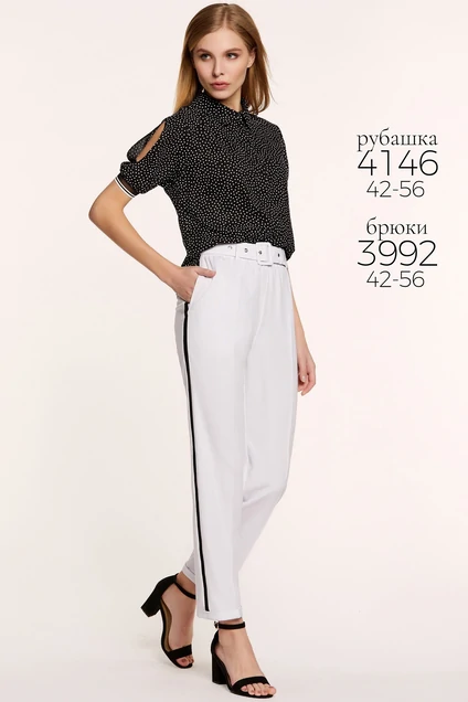 - элегантная блузка из ткани с принтом в мелкий горох, прямого кроя с разным уровнем переда и спинки, легкость модели придают разрезы по рукавам;