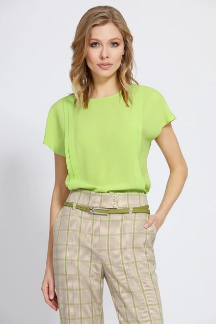 Однотонная блузка из лёгкого приятного материала, с округлой формой горловины и короткими цельнокроеными рукавами, украшена вертикальными складками в два ряда. Свободный крой позволяет чувствовать себя максимально комфортно, а каплевидная застёжка на навесную петлю и ювелирную пуговицу добавит удобства при носке. Блузка станет акцентной деталью ваших образов.