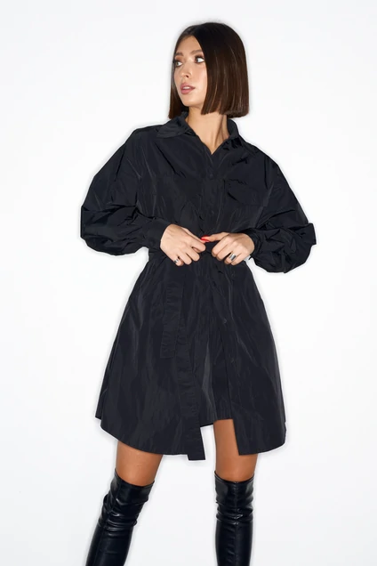 Рубашка женская прямого кроя с рукавом со спущенным плечом . Воротник рубашечного типа. Застежка по переду петли – пуговички. Спинка цельнокроеная. По низу рукава манжет с застежкой, застежка пуговичка. По переду нашиты карманы. В комплекте пояс из основной ткани изделия. Длина рубашки 89, длина рукава 61.