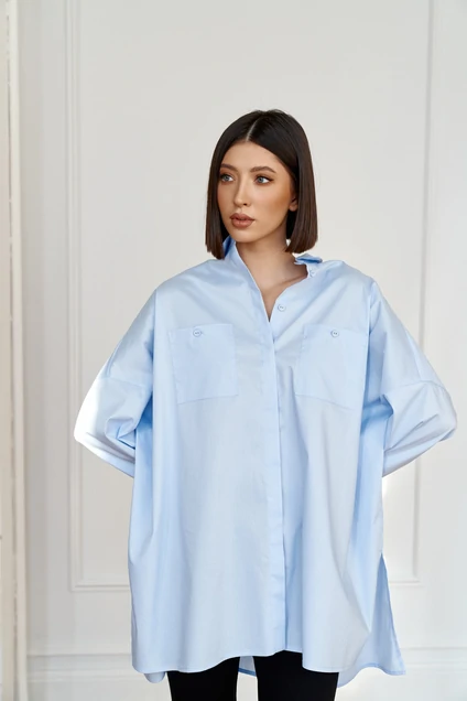 Рубашка женская прямого кроя с рукавом со спущенным плечом. Воротник рубашечного типа. Застежка по переду на скрытые под планкой пуговицы. В боковых швах разрезы. Спинка отрезная. Рукав без манжета, с пуговичкой по середине рукава и скрытым элементом для удержания рукава при сборке. По переду нашиты карманы. Длина изделия 80, длина рукава 53.
