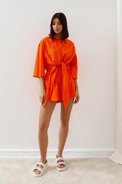 Рубашка прямого свободного кроя с цельнокроеными широкими завязками выполнена из льняного полотна цвета мандарин. Нестандартный крой рубашки позволит Вам создать смелые и яркие образы. Идеальный вариант на море.