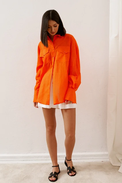 Рубашка прямого свободного кроя выполнена из яркого хлопкового полотна цвета мандарин. Насыщенный цвет придаст образу яркость.