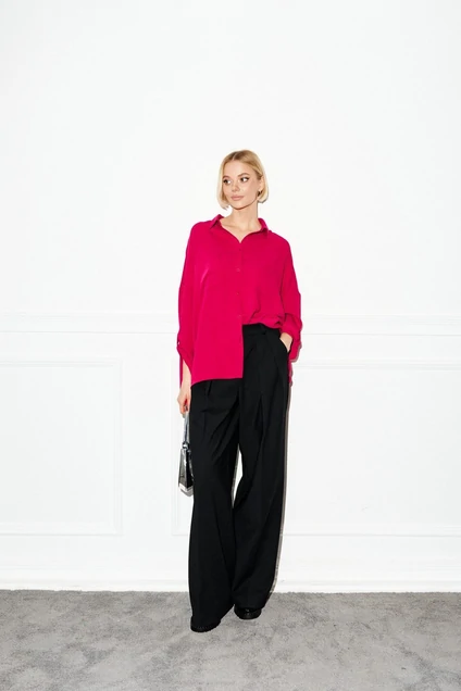 Рубашка прямого свободного кроя выполнена из легкой струящейся ткани. Яркий цвет полотна рубашки поможет создать для Вас насыщенные образы.Характеристики: прямой свободный крой, воротник рубашечного типа, застежка центральная на петли пуговички. По переду нашиты два крупных кармана . Спинка отрезная . Рукав спущен, без менжеты, с пуговичкой по середины рукава и скрытым элементом для удержания рукава при сборке. В боковых швах разрезы. Длина изделия 65 длина рукава от края горловины 71 см.