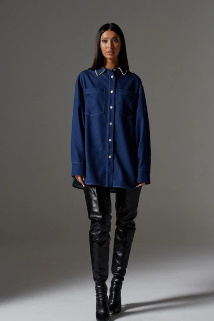 Рубашка прямого кроя выполнена из джинсового полотна с акцентными бусинами на воротнике. Джинсовая рубашка универсальная вещь в гардеробе , сочетается как с классическими брюками и юбками так и с джинсами и брюками в спортивном стиле, стильное украшение на воротнике рубашке позволит создать индивидуальный образ. Характеристики: прямой крой, отложной остроугольный воротник, воротник по периметру украшен белыми бусинами, застежка центральная на петли пуговицы, рукав слегка спущен, по низу рукава широкая манжета на пуговичке, по переду крупные накладные карманы , спинка отрезная. Длина изделия 77, длина рукава 78 от края горловины