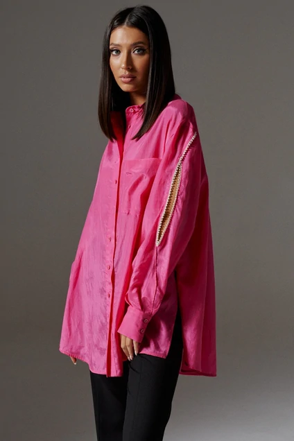 Рубашка прямого кроя с декоративными вырезами по рукавам. Акцентная стильная рубашка позволит создать образы в разных стилях, отлично сочетается с классическими брюками, юбками шортами, джинсами. Характеристики: прямой свободный крой, воротник на стойке рубашечного типа, рукав спущен, по рукаву декоративные вырезы, по периметру декоративные вырезы украшены мелкими бусинками, по низу рукава манжета на пуговичках, застежка центральная петли пуговицы, по переду карман, спинка отрезная, в боковых швах разрезы. Длина изделия по спинке 77 см, длина рукава от края горловины 78 см.