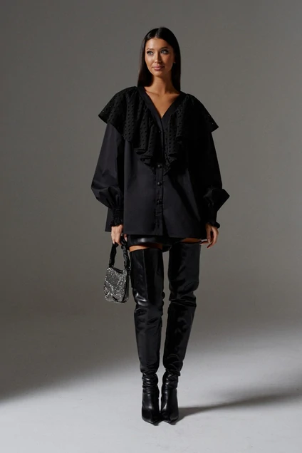 Блуза свободного кроя из хлопкового полотна с крупным воротником декорированный прорезными узорами. Блуза прекрасно подойдет для каждодневных образов, акцентный крупный воротник придает изделию торжественность. Характеристики: прямой свободный крой, V образный вырез горловины, крупный воротник выполнен из хлопковой ткани декорирован прорезными узорами, застежка центральная на петли пуговички, в боковых швах по низу изделия разрезы, рукав втачной, по низу рукава в области запястья широкая резинка со сборкой, рукав заканчивается воланом. Длина по спинке 66, длина рукава 69.