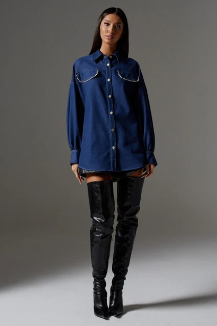 Рубашка прямого кроя выполнена из джинсового полотна с акцентными бусинами по переду. Джинсовая рубашка универсальная вещь в гардеробе , сочетается как с классическими брюками и юбками так и с джинсами и брюками в спортивном стиле, стильное украшение на рубашке позволит создать индивидуальный образ. Характеристики: прямой крой, отложной воротник, застежка центральная на петли пуговицы, рукав свободного кроя спущен, по низу рукава широкая манжета на пуговичке, по переду имитация карманов с клапаном, клапан украшен контрастными белыми бусинами, спинка отрезная, по спинке декоративная деталь , деталь, по периметру, украшена белыми бусинами. Длина изделия 77, длина рукава 76. от края горловины