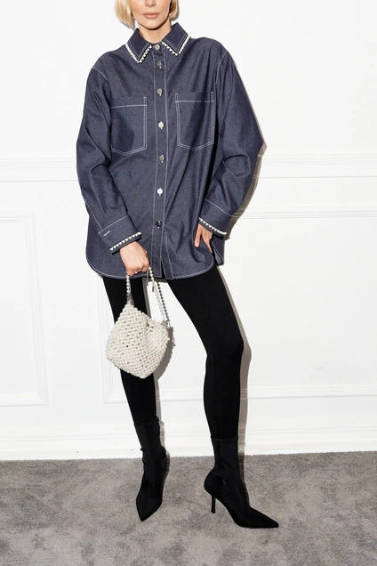 Рубашка прямого кроя выполнена из джинсового полотна с контрастной строчкой и белыми акцентными бусинами. Джинсовая рубашка универсальная вещь в гардеробе , сочетается как с классическими брюками и юбками так и с джинсами и брюками в спортивном стиле, стильное украшение на рубашке позволит создать индивидуальный образ.Характеристики: прямой крой, отложной воротник, застежка центральная на петли пуговицы, рукав свободного кроя спущен, по низу рукава широкая манжета на пуговичке, по переду накладные карманы, спинка отрезная с декоративной сборкой, низ изделия плавный срез. Воротник рубашки и манжета украшена двумя рядами бусинок ряд крупных, ряд мелких бусинок. Длина изделия 78 , длина рукава от края горловины 79.