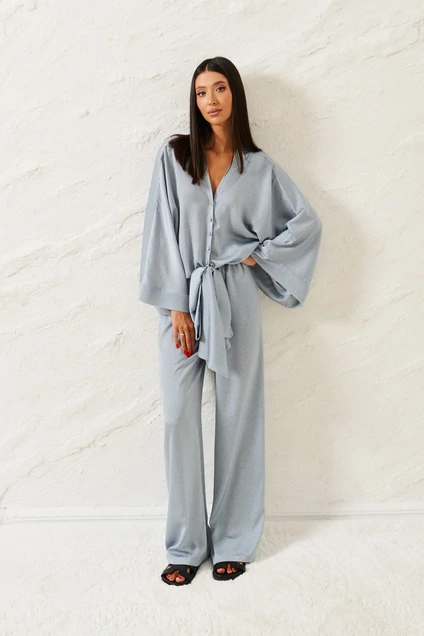 Рубашка свободного кроя с декоративными элементами выполнена из струящейся ткани. Характеристики: свободный крой, V образный вырез горловины, застежка центральная на петли пуговички, рукав свободного кроя цельнокроеный, низ изделия по передней части - стабильная вставка с декоративными удлиненными элементами которые можно завязывать на узел, на бант, по заднему полотну вставка на резинке. Длина по спинке 53 см, длина рукава от края горловины 71 см.